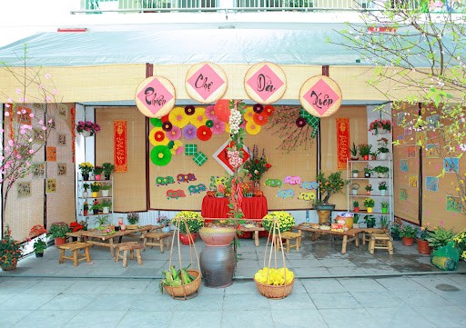 - Thiết kế không gian truyền thống với các yếu tố đặc trưng của Tết như câu đối, hoa mai, hoa đào, đèn lồng.